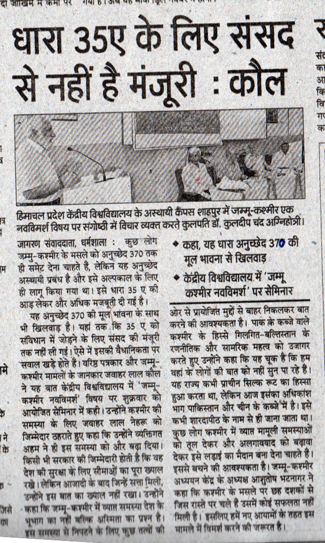 (दैनिक जागरण ) धारा 35a के लिए संसद से नही है मंजूरी : कौल